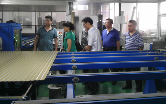 圖1 新建聚氨酸復合板生產(chǎn)工廠 在交流現(xiàn)場,省墻改辦湯主任詳細了解了捷陽公司改性聚氨酯復合板優(yōu)于同類墻體保溫板的技術(shù)性能指標:復合防火A級、導熱系數(shù)小于0.021、吸水率小于3等一系列具備絕熱、隔音、使用壽命長、耐氣候強的特點,省墻改領(lǐng)導還詢問了項目發(fā)展前景等有關(guān)情況。